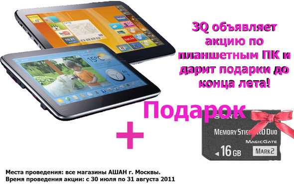 С 30 июля по 31 августа, покупая планшетные ПК марки 3Q - TS1003T и TU1102T - в магазинах Ашан г. Москвы, Вы получаете в подарок - дополнительную карту памяти объемом 16Гб.